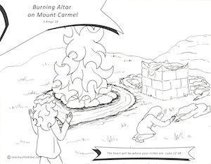 He had 2 bulls brought to the mountain and placed on altars. His challenge to the prophets of Baal was that the god who sent down fire to burn up the bull on their altar without the prophet starting the fire would be the one true God. He had the prophets of Baal start first. They put their bull on the altar and called for their god named Baal. (Have fun with this when you tell the story) "Baal! Baal! Send fire down! Baal? Anyone there? Hellooooooo????"