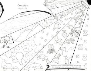 • One method to add to the creativity of the coloring sheet is to fan fold the paper on the lines so it looks like a Chinese fan. Creation day 1 is on the first fold, the other days follow in sets of two. The older grades have the skills to complete. Not only a useful fan to keep, it could be a functional paper airplane (for the boys) with slight rearrangement of dividing lines.